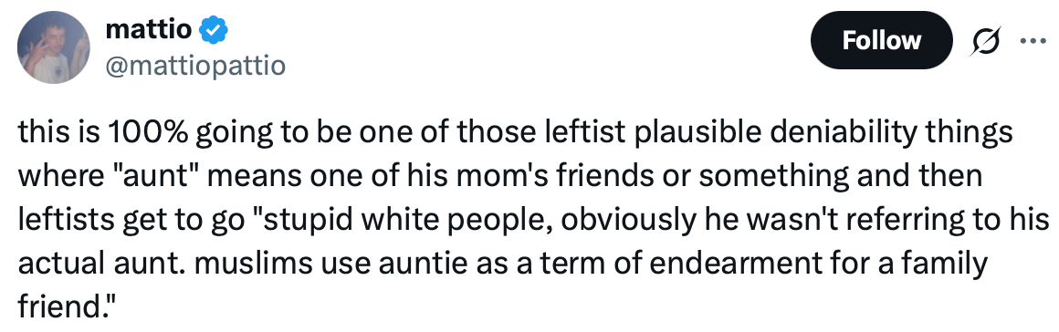 I mean, the vast majority of the planet automagically calls any much older woman aunty whether or not she's related to you, so the idea that Mamdani's aunt not being his mom or dad's sibling was ever gonna be a gotcha, in a city proudly full of black and brown people, is honestly WILD. Choosing to be bothered by the man who eats food with his hand instead of the serial creep who sent seniors to their deaths during the pandemic is a choice—and let's be clear, it's a fucking racist choice. Mamdani's ascendance has made the absolute worst people big mad, and frankly that's yet another reason to like him.